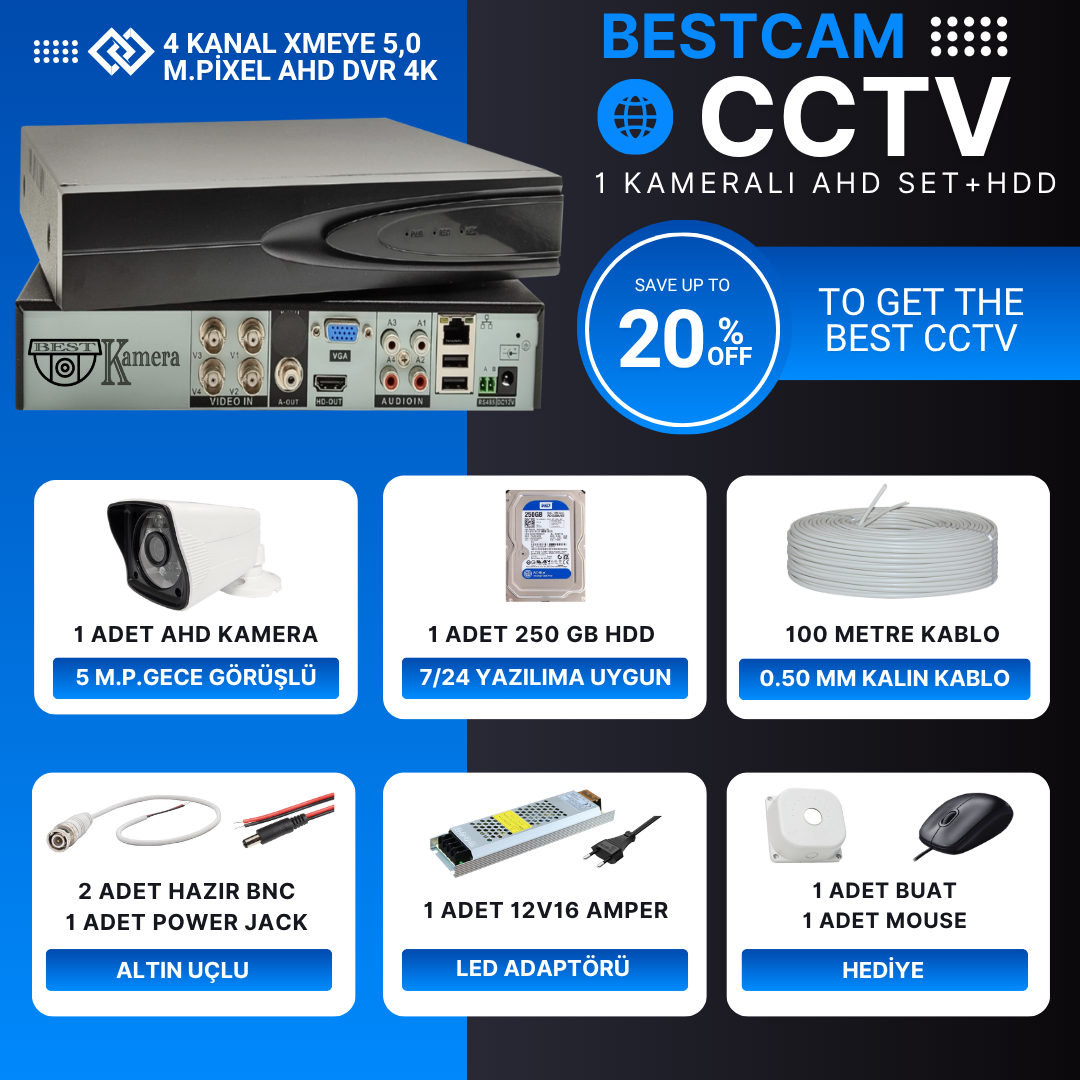 Bestcam Ahd Eco 5.0 Mega Piksel Sony Lensli 1 Kameralı Full Paket Güvenlik Seti Sistemi HDD Dahil